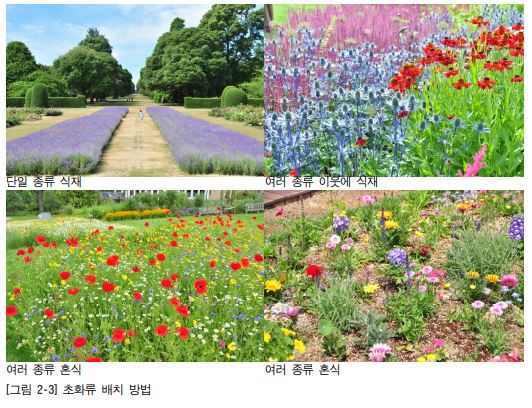 종류에 따라 다르지만 초화류는 어린 묘에서 다 자 라 개화하는 성숙한 식물체가 될 때까지 생육 속도 가 빠르고 크기 변화가 크므로 시공 도면을 작성할 때 다 자란 초화류의 크기를 고려해야 한다.
