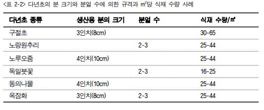 국내 초화류 도감이나 생산 농원 카탈로그엔 종류 별 규격, 즉, 초장이나 초폭에 대한 자료가 충분하 지 않다. 대체로 생산용 화분의 크기를 규격으로 표시하거나 다년초일 경우에는 종류에 따라 생산용 화분 내 근원부에 형성된 분얼의 수를 기준으로 규 격을 표시하는 경우가 일반적이며, 주요 다년초에 대해서는 ㎡ 당 식재 수량에 대한 지침을 제시하고 있다.