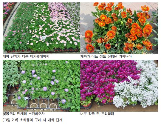 초화류의 크기는 초장과 초폭으로 결정되고 종류와 생육 정도에 따라 크기에 큰 차이를 보인다. 식물의 성숙 정도에 따라 식재지 완성도에 차이가 있기 때문에 식재 계획에 따라 필요한 생육 단계에 있는 식물을 구매하여야 한다. 어린 묘를 구매할 것인지 이미 개화가 시작된 식물을 구매할 것인지 잘 파악하여 구매 시 성숙 정도에 대한 오류를 범하지 않도 록 한다. 경우에 따라 필요한 생육 단계의 식물을 구하지 못할 수 있기 때문에 이러한 상 황에서 어떻게 해야 할지 미리 대책을 세워야 한다. 특히 원하는 종류의 식물이 없거나 수량이 부족할 경우 같은 색과 개화기의 식물을 구하 지 못할 경우, 또는 색과 개화기는 맞아도 초장이 맞지 않을 경우 어떻게 해야 할지 대안을 가지고 있어야 한다.