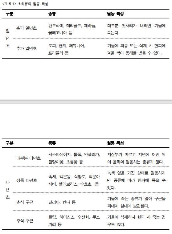 초화류는 생육 특성에 따라 겨울을 보내는 방식이 다르다. 춘파 일년초와 열대성 초화류 는 첫서리가 오면 대부분 동해를 입고 시들어 죽는다. 추파 일년초는 가을에 파종하거나 식재하지만 한국에서 너무 추울 경우 월동하지 못하는 것들이 있어 겨울에 보온 처리를 해 주거나 이듬해 봄에 식재한다. 다년초는 첫서리가 온 후에도 늦게까지 꽃이 피는 종류가 있지만 몇몇 상록 다년초를 제 외하곤 대부분 온도가 떨어지는 겨울에 지상부가 마른다. 그러나 지면 가까이 어린 새싹 이 올라 온 채로 겨울을 보내는 다년초들이 많다. 춘식 구근은 겨울에 죽는 종류가 많아 구근을 파내어 보관했다 이듬해 봄에 심는다. 추식 구근은 수선화와 같이 월동이 잘 되는 종류도 있고, 튤립이나 히아신스처럼 종류에 따라 월동하지만 그대로 토양 속에 둘 경우 월동 개체 수가 점점 적어지는 종류가 있다. 털머위나 도깨비고비와 같은 남부 지방 다년 초는 겨울에 중부 지방에서는 죽는다. 라벤다와 센톨리나는 원산지에서는 저관목이지만 한국의 중부 지방에서는 겨울에 지상부가 죽는 경우가 많아 다년초의 특성을 보이는데 추 위가 심하면 뿌리도 죽는다. 속새, 맥문동, 석창포, 맥문아재비, 헬레보러스 등 몇몇 상록 다년초를 제외하면 대부분 11 월 말이면 초화류는 생육이 끝난다. 이러한 초화류의 특성을 이해하여 뿌리 부근의 토양 을 따뜻하게 유지해 주면 겨울에 동해를 입지 않고 이듬해 봄에 생육이 빠르게 재개된다. 초화류의 특성에 맞는 월동 대책을 수립하고 실시하기 위하여 초화류의 종류별 월동 특성을 이해해야 한다.