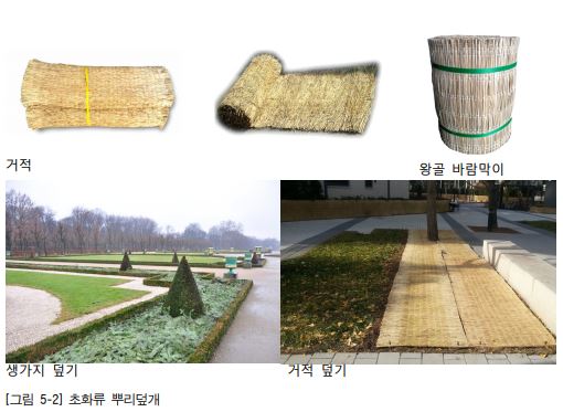 옥상의 한풍지나 음지에 식재된 상록 다년초는 짚으로 식물체 전체를 둘러싸거나 실내로 이동할 수 없는 큰 화분에는 고깔을 만들어 준다.