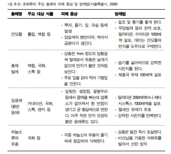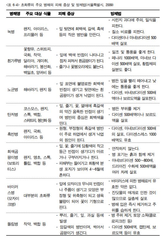 3. 조사한 초화류의 피해 증상, 병충해명, 방제법을 정리한다. 병충해 피해가 있는 초화류를 조사하여 피해 날짜별로 피해 증상과 병충해명, 방제법을 정리한다.