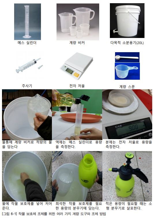 작물 보호제 설명서의 정량과 살포 횟수 등에 관한 안전 기준을 철저히 지킨다. 기준량보 다 많은 양을 뿌릴 경우 작물 보호제 잔류량이 높아져 식물에 해를 끼칠 수 있으므로 작 물 보호제를 조제할 때는 계량기를 이용하여 정확한 용량을 계량한다. 필요한 작물 보 호제의 용량을 관수 시 필요한 수량과 비교하여 1m2 면적당 어느 정도의 물이 필요한지 체크하고 적합한 물통을 준비한다. 선택한 작물 보호제를 설명서의 정량에 따라 저울, 계 량 비커, 계량 스푼, 계량 실린더, 20L 물통 등을 이용하여 정확하게 계량하여 물에 희석 하여 잘 저어 준다.