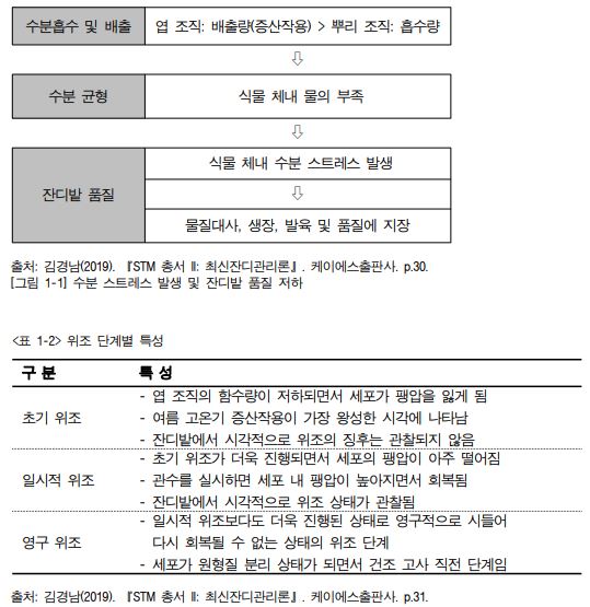 1. 기공을 통한 수분 배출량이 뿌리 조직의 수분 흡수량보다 많으면 식물 체내 수분 균형이 깨져 잔디 생육에 장애가 나타날 수 있다[그림 1-1].