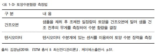 2. 토양수분 함량을 파악할 수 있는 직접적인 방법은 잔디밭에 텐시오미터(tensiometer) 수분계를 설치해서 측정하거나, 또는 토양 샘플을 채취 후 바람에 말려 건조오븐 (drying oven)을 통해 함수율을 측정할 수 있다<표 1-3>.
