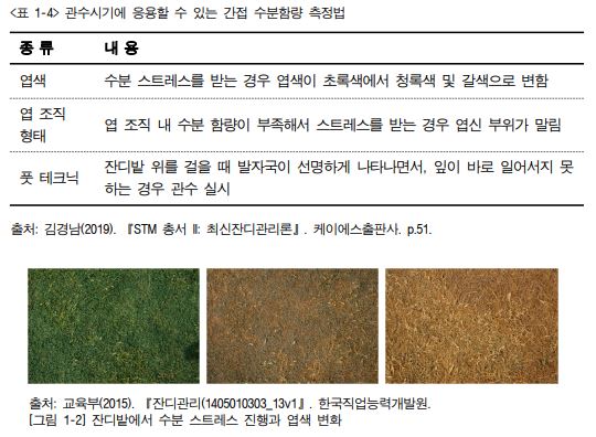 5. 또한, 관리자가 기구 도움 없이 오랜 관찰 및 경험을 통해 잔디밭의 변화를 확인하면 서 관수시기를 결정할 수도 있다. 이 때 관수시기 결정 시 풋 테크닉(foot technique) 등 다음과 같이 활용할 수 있는 다양한 간접 수분함량 측정 방법을 충분히 숙지하여 적절하게 활용한다<표 1-4>.