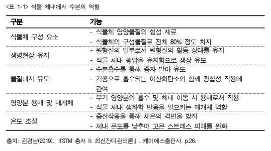 식물 체내 80% 이상을 차지하고 있는 수분은 종자 발아, 영양분 이동, 기관 발달, 광합성 등 여러 가지 식물 생리작용에 중요하다<표 1-1>. 잔디밭에서 관리자가 관수 관리를 효율적으로 하기 위해서는 기상환경, 수분흡수 및 배출요인, 증산작용, 수분 스트레스 반응 등 여러 가지 관련 요인을 식물-토양-수분(Soil-Plant-Water) 콘셉트에 의해 이해하는 것이 필요하다.