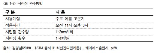 3. 시린징 관수 시 관수시간, 관수량 및 관수횟수는 일상적인 관수방법과는 다르게 실시한다<표 1-7>.
