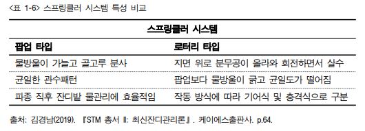 1. 양질의 잔디관리에 가장 많이 사용하고 있는 관수장비는 잔디밭 위에서 살수 되는 오버헤드 스프링클러 시스템이다. 관리자는 효율적인 관수관리를 위해서 오버헤드 스프링클러 시스템의 2가지 유형인 팝업 타입 및 로터리 타입의 특성에 대해 정확 히 이해한다<표 1-6>.