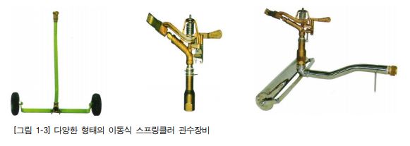 이동식 QC(Quick-coupling) 스프링클러 방식도 회전형으로 작동되는 관수 방식이다. 관수 헤 드는 충격식 로터리 헤드를 이용하며 내구성은 강한 편이다. 하지만 이동식 스프링클러는 탈 부착식으로 사용에 다소 불편하다. 이 방식은 주로 저관리 수준으로 유지되고 있는 잔디밭 또는 정기적인 관수관리 외에 보조적으로 관수가 필요한 지역에 효율적으로 사용할 수 있다 [그림 1-3].