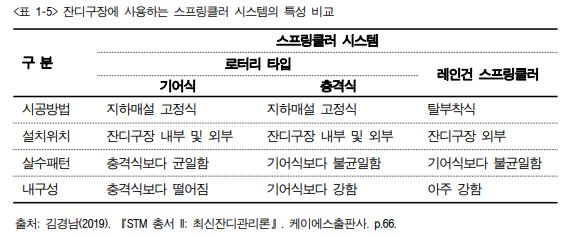 2. 기어식, 충격식 및 레인건 스프링클러 로터리 타입 시스템은 분사작동 방식에 따라 기어식(gear-style)과 충격식(impact-style)으로 구분된다. 잔디구장에 사용되고 있는 기어식, 충격식 및 레인건(rain-gun) 스프링클러 시스템 의 특성 차이는 다음과 같다<표 1-5>.