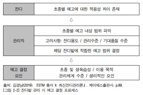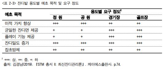 5. 잔디예고는 초종, 생육습성, 이용 목적, 관리수준 및 생리적 요인 등을 종합적으로 고 려해서 과학적인 콘셉트에 의해 결정한다[그림 2-2].