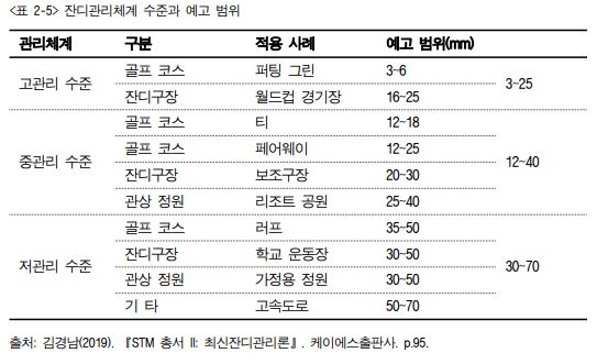 3. 잔디 예고는 동일한 초종으로 조성된 잔디밭일지라도 관리체계 수준에 따라 다르게 적용한다. 일반적으로 러프와 같은 저관리 수준의 품질이 낮은 잔디밭은 30~70mm, 중 관리 수준은 12~40mm, 그리고 퍼팅 그린과 같은 고관리 수준의 고품질 잔디밭일 때 3~25mm 사이에서 예초를 실시한다<표 2-5>.