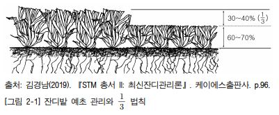 잔디밭 예초 시 지켜야 할 기본 개념 중 하나는 1/3 법칙을 적용하는 것이다. 이는 1회 예초 시 엽조직은 30~40% 이내 범위에서 깎아 주어야 한다는 개념이다[그림 2-1]. 왜냐하면 엽 조직이 과도하게 잘려나가면 지상부 및 지하부 조직의 재생장 과정에 생리 적 균형이 깨져 회복력 저하와 잔디밭 품질이 크게 훼손되기 때문이다. 일반적으로 중 정도 관리 수준으로 유지되는 관상용 한지형 잔디면 대상 잔디 초종의 예고 기준 범 위에서 1~2cm 정도 더 자랐을 때 잘라 주는 것이 적절하다.