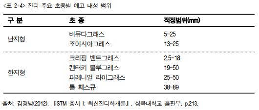 2. 또한, 예초 관리 시 초종별 예고 내성 범위를 파악해서 해당 잔디밭에 적용한다<표 2-4>.