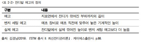 1. 예고의 정의 잔디를 깎을 때 그 높이는 예고, 벤치 세팅(bench setting) 예고 및 실제 예고 등 여러 가 지 용어로 불리고 있다<표 2-2>.