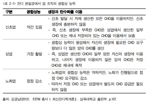 (1) 잔디깎기 작업 시 지상부 엽 조직 제거로 광합성 능력이 저하되면서 탄수화물 합성 량이 감소하게 된다. 하지만 새로 발생하는 신초는 광합성 능력이 아주 미약하므로 생장을 위해 성엽에 있는 잉여 탄수화물을 이용하거나 관부, 지하경 및 포복경 등에 있는 저장 탄수화물을 이용한다<표 2-1>.