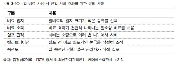 5. 현재 국내에서 잔디밭 관리 시 실무적으로 알 비료를 많이 사용하고 있으므로 관리자는 알 비료로 균일한 시비 효과를 달성할 수 있도록 다음과 같은 사항을 숙지 후 비료를 공 급한다<표 3-10>.