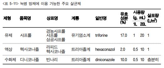4. 녹병 방제 난지형 및 한지형 잔디밭에 공통으로 발병하는 녹병 방제에 이용 가능한 제형별 주 요 살균제는 다음과 같다<표 5-11>.