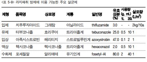 2. 난지형 잔디밭의 라지패취 방제 난지형 잔디밭에 한국잔디에 자주 발병하는 라지 패취 방제에 이용 가능한 제형별 주요 살균제는 다음과 같다<표 5-9>.
