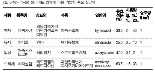 3. 한지형 잔디밭에 피시움 블라이트 방제 한지형 잔디밭에 자주 발병하는 피시움 블라이트 방제에 이용 가능한 제형별 주요 살균제는 다음과 같다<표 5-10>.