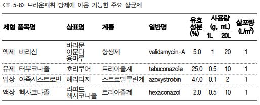1. 한지형 잔디밭의 브라운패취 방제 한지형 잔디밭에 자주 발생하는 브라운 패취 방제에 이용 가능한 제형별 주요 살균 제는 다음과 같다<표 5-8>.