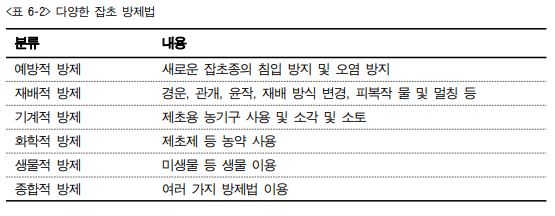 잡초의 유입은 일순간에 이루어지지만 이로 인한 잡초 문제는 오랜 기간 지속할 수 있으 므로 잡초 방제는 중요하다. 잡초 방제 수단은 손으로 제거하는 방식에서부터 최근 개발 된 생물학적 방법까지 다양하다<표 6-2>.