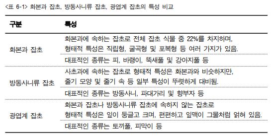 3. 잡초는 형태적 특성에 따라 크게 화본과 잡초, 방동사니류 잡초 및 광엽계 잡초로 나눌 수 있다<표 6-1>, [그림 6-1].