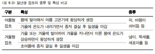 2. 성공적인 잡초 방제를 위해서는 생육상태를 고려하여 방제를 시행한다. 특히 방제비용 이 높은 일년생 잡초는 계절에 따라 발생 종류가 다르므로 여름형 잡초와 겨울형 잡 초에 대한 특성을 숙지하여 계절별 방제를 정확히 시행한다.