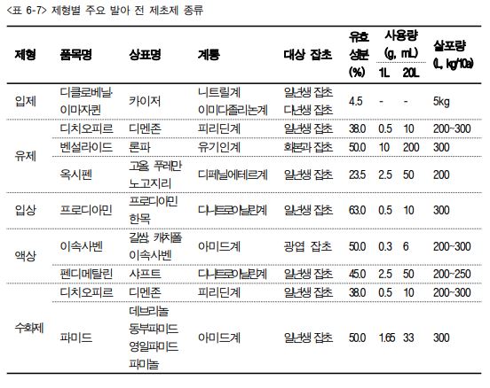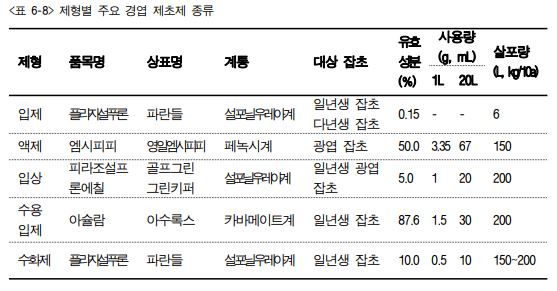 2. 발아 후 처리 제초제: 잡초가 발아되어 뿌리 활착이 된 잡초의 경엽에 약제를 처리 하여 고사시키는 제초제로 제형별 대표적인 종류는 다음과 같다<표 6-8>.