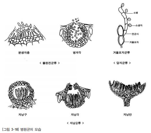 2. 병환부에서 관찰된 병원균의 모습을 [그림 3-18]과 같이 비교한다.