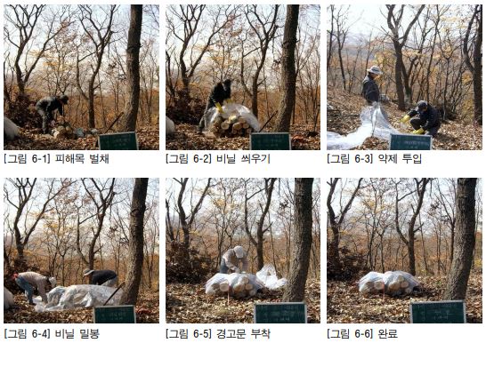 병해로 인해 고사한 나무를 벌채하고 전염원이 되는 잔가지 및 낙엽까지 모아 소각하여 원목 형태로의 이용을 방지한다.