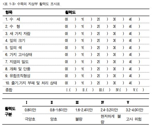 피해 발생 양상 및 피해 증상을 관찰하고 조사하여 기재한다. 수세가 쇠약한 수목 을 대상으로 <생육 환경 개황 조사표>를 작성한다.