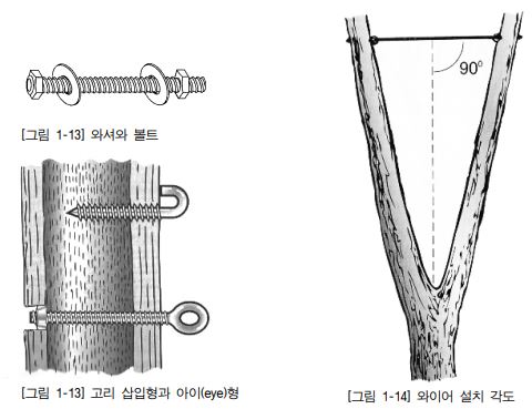 1. 직경 40cm 이하의 같은 줄기나 분지되어 있는 부분을 선택하고 분지점의 수직 방 향의 선과 설치할 와이어의 평행선이 90°를 이루도록 한다.
