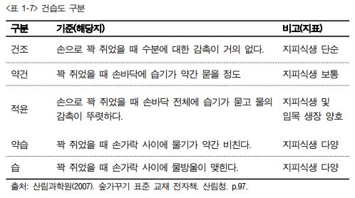 선행 강우 경과 일수를 감안(대략 6일 후)하여야 하며, 탁구공 크기 정도의 토양 을 떼 내어 2~3회 움켜쥐어가며 아래 기준에 따라 건조, 약건, 적윤, 약습, 습으로 판단한다.
