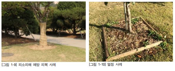 수간에 발생한 맹아는 전정가위를 이용하여 매끈하게 잘라 주고, 피소 피해를 방 지하는 목적이므로 두껍지 않게 차광 효과가 있을 정도로 얇게 감아 준다.
