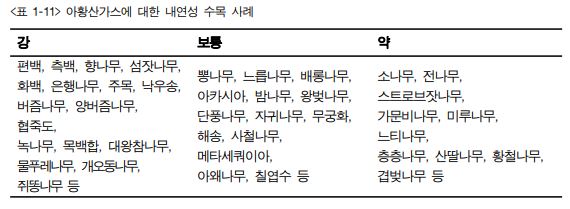 오염 물질에 대해 수종별 생리적 기능에 따라 각각 차이가 있으며, 저항성의 기작은 기공 개폐를 통해 침입을 억제하는 기능과 흡수된 오염 물질의 독성을 변화시키는 능력이 다르다.
