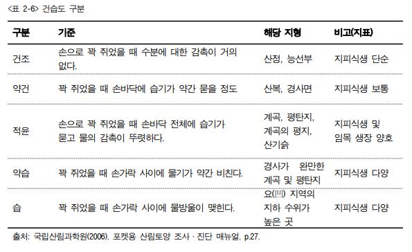 선행 강우 경과 일수를 고려하여야 하며, 탁구공 크기 정도의 토양을 떼 내어 2~3 회 움켜쥐어가며 아래 기준에 따라 건조, 약건, 적윤, 약습, 습으로 판단한다.