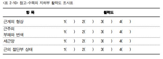 나무뿌리 크기는 소(2~5㎜), 중(5~10㎜), 대(10㎜이상)로 양은 많다(10%이상), 있다 (5~10%), 적다(5%미만)로 구분한다.