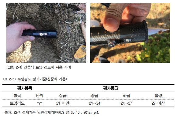 실습장이나 조경수 식재 현장에서 간이 측정기와 육안으로 수목 생장에 필요한 인자를 중 심으로 토양의 물리·화학성을 조사한다.