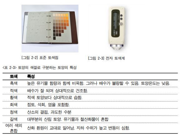 토양 단면에서 볼 수 있는 형태적 특징으로서 각 층위의 토양을 자연 상태로 채 취하여 음지에서 토색첩(soil color charts)으로 판정한다.