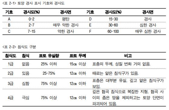 나무뿌리 크기는 소(2~5㎜), 중(5~10㎜), 대(10㎜이상)로 양은 많다(10%이상), 있다 (5~10%), 적다(5%미만)로 구분한다.