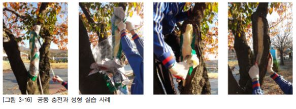 상처 부위나 공동이 더 이상 부패하지 않도록 조치하며, 수간의 물리적 지지력을 높여주 고, 미관상 자연스러운 외형을 가지도록 한다. 재료는 경제적이면서 내구성이 있는 재료를 사용하게 된다.