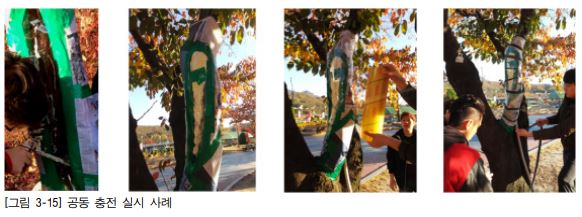 1. 노출된 형성층 부위와 수피에 우레탄폼이 붙지 않도록 하기 위한 것으로 공동의 형성층 부위와 가장자리 부분에 테이프를 붙여 주변을 신문지로 싼다.