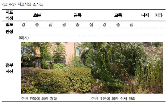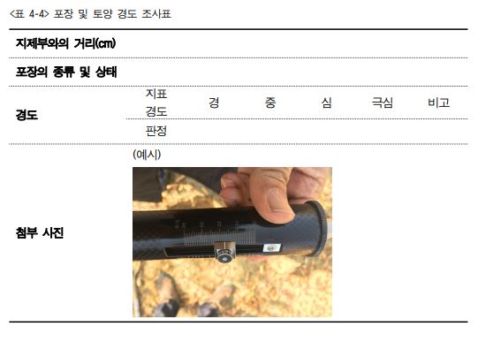 수목 지제부와 거리, 포장의 종류 및 상태를 기재하고 토양 경도계를 이용하여 수 치를 비고란에 표시하고 지표 경도를 판정한다.