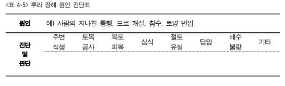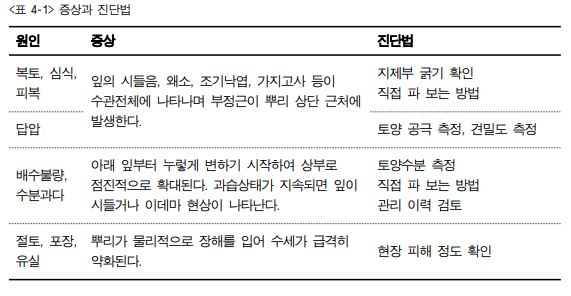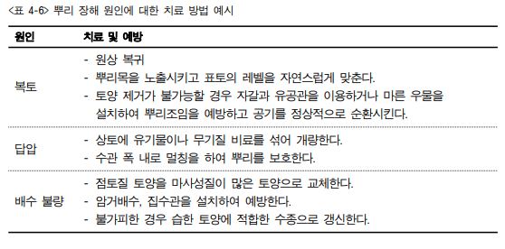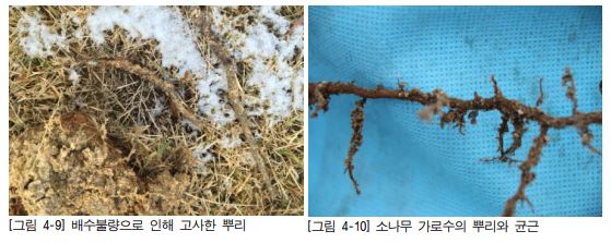 토양 공극에 물이 차게 되면 수분, 산소 공급이 원활하지 않아 뿌리가 부패할 수 있으 며 토양온도의 저하로 뿌리의 흡수 기능이 저하되어 수세가 급격히 약화된다.