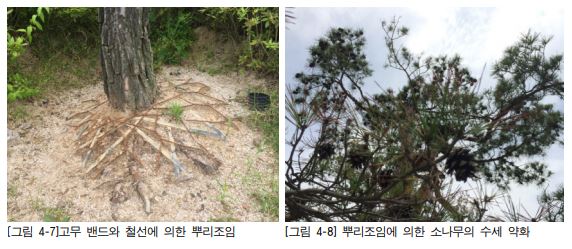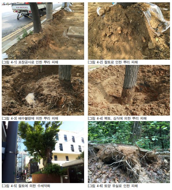 뿌리 조사 및 뿌리 수술 없이 도로나 인도 등의 포장공사를 진행하면 그 범위에 따라 기존 뿌리에 대한 훼손 때문에 수세가 급격히 나빠진다.