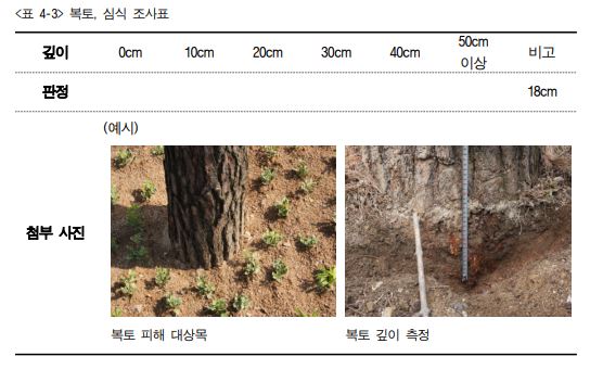 지제부의 뿌리목이 노출될 때까지 토양을 제거한 후 줄자를 이용하여 정확한 깊이를 측정하고 사진을 촬영한다.