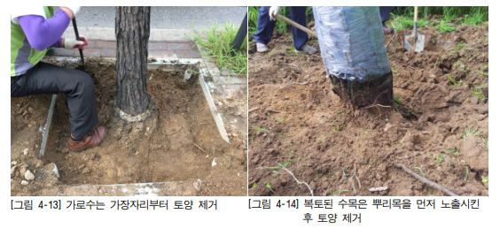 2. 보행로인 경우에는 보도블록을 들어 올린 뿌리나 도로변, 주택 건물로 향한 뿌리를 중심으로 파도록 한다. 3. 느티나무, 버즘나무와 같이 수평근이 발달한 수목은 가장자리부터 토양을 제거하도 록 한다. 4. 복토나 심식이 된 수목은 뿌리목을 먼저 노출시킨 뒤 기존 토양의 높이와 뿌리목과 의 깊이를 측정한 뒤, 뿌리의 가장자리 방향으로 토양을 제거하여 뿌리를 조사한다.