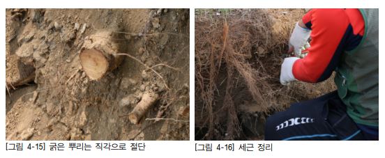 뿌리 절단 및 박피: 뿌리 절단과 박피: 살아 있는 부위에서 예리하게 절단하고 안쪽 3cm 폭으로 환상박피한다.